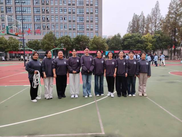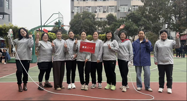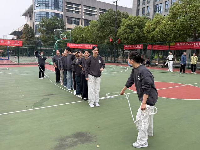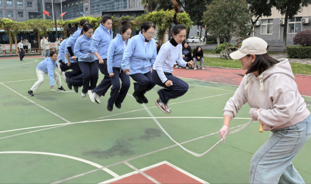 本次比赛设有“鱼贯‘8’字跳长绳”和“集体跳长绳”两个项目,不仅考验参赛选手的个人弹跳与节奏感,更注重团队的默契配合与协作精神。赛场上,长绳在空中划出优美的弧线,女教职工们个个精神抖擞,身姿矫健。在“8”字跳长绳环节,队员们如游鱼般依次穿梭,行云流水,衔接紧密;在集体跳长绳环节,大家步调一致,齐起齐落,展现了高度的团队凝聚力。场边的啦啦队呐喊助威声此起彼伏,每一次精彩的跳跃都引来阵阵喝彩,整个篮球场沉浸在一片欢乐与活力的海洋中。